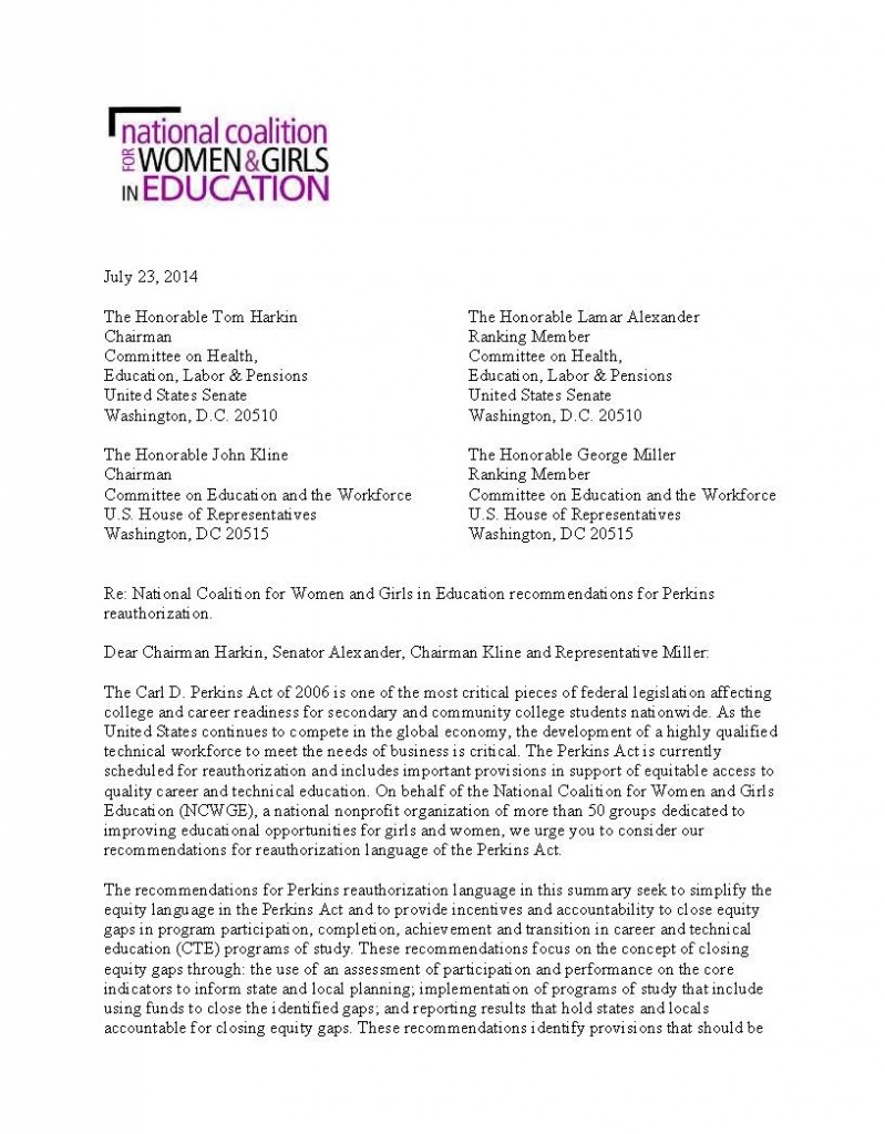 In a letter dated July 23, NCWGE (of which NAPE is a member) urges the House and Senate to consider its recommendations for reauthorization language of the Perkins Act. Read Letter